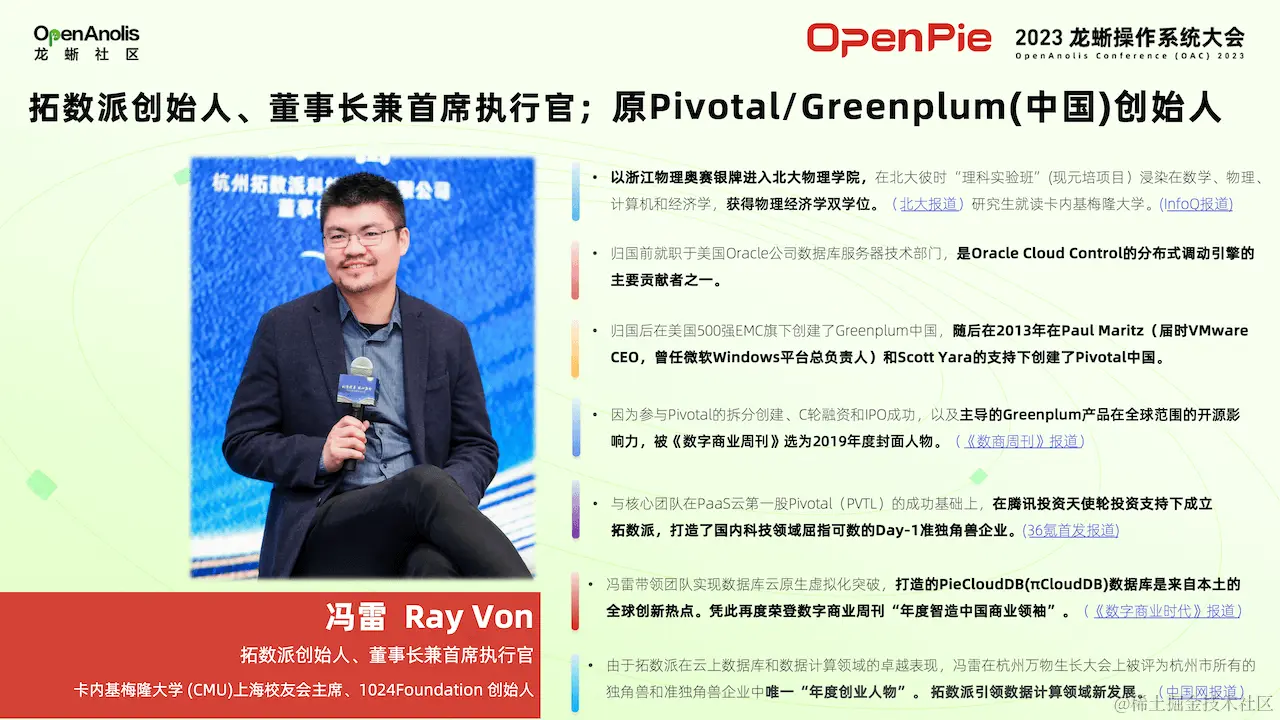 拓数派拥有强悍的研发核心团队和有成功上市经验的管理团队。其核心团队成员主要来自 Pivotal、IBM、腾讯、字节跳动、快手、Oracle 等世界 500 强以及国内头部互联网公司。拓数派创始人兼 CEO 冯雷(Ray Von)是数据云和人工智能领域的连续创业者和技术引领者。冯雷于 2010 年从美国硅谷归国,曾在 500 强公司 EMC 旗下创建 Greenplum 中国研发部门工作。2013 年随着全球 Pivotal 组建,冯雷先生在中国 Greenplum 大数据和 VMWare 的 PaaS 云的基础上组建了 Pivotal 中国研发中心,推动了 Greenplum 大数据库、CloudFoundry PaaS 云等知名开源产品的领域领先地位。