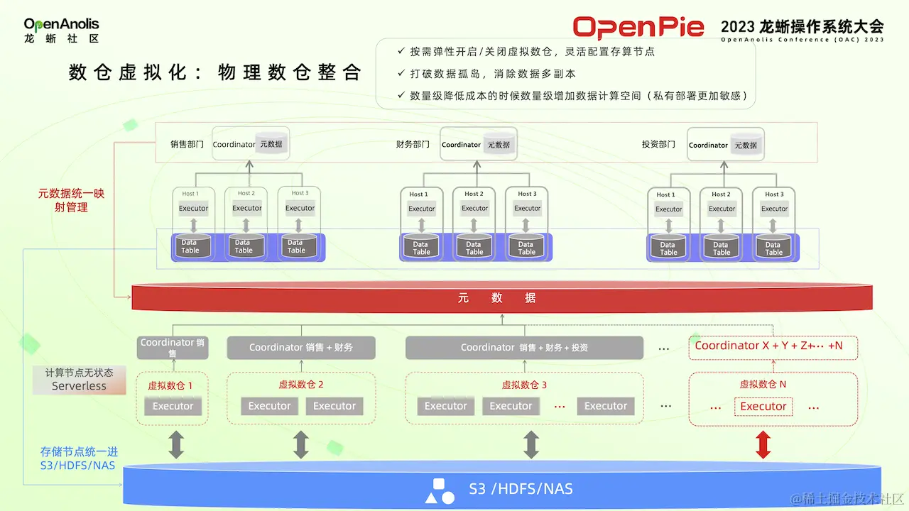 虚拟机技术可以把一台物理服务器切换成若干台小的服务器,把它一台物理服务器的资源切换虚拟机,给不同的用户来用。同样我们希望把数仓资源切算成若干的虚拟数仓,然后交给各个部门来使用,提高硬件的使用效率。以上解释了为什么拓数派团队要对 PieCloudDB 打造基于云原生的 eMPP 架构。