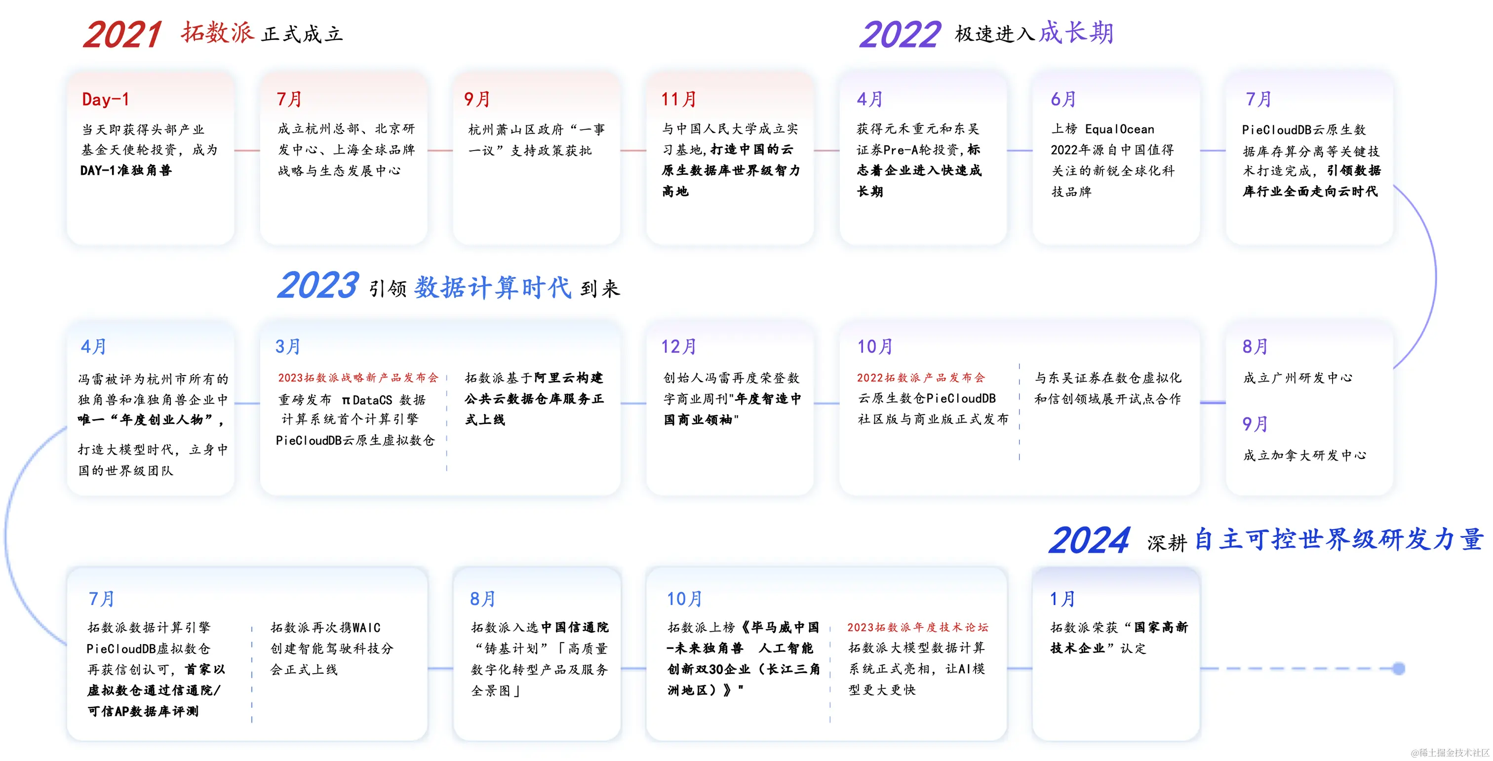 拓数派 2021 年创立,迅速进入快速发展阶段,引领数据计算时代的到来。成立当天即获得头部产业基金天使轮投资,成为 DAY-1 准独角兽。2022 年拓数派发布了云原生虚拟数仓 PieCloudDB 社区版与商业版。2023 年拓数派大模型数据计算系统 πDataCS 正式亮相,让 AI 模型更大更快。