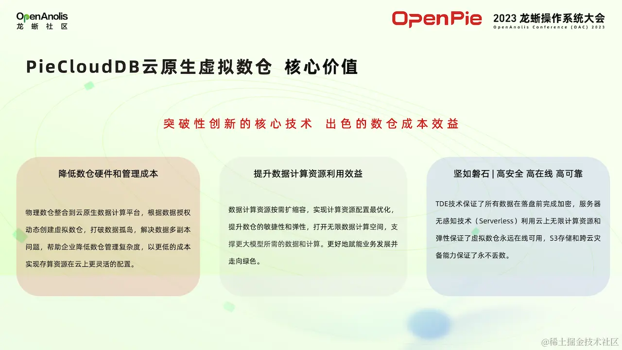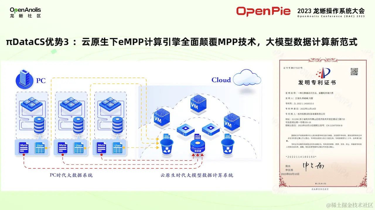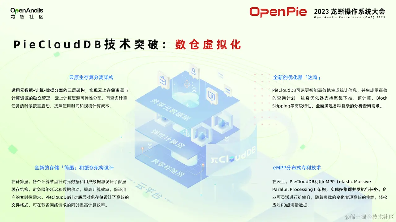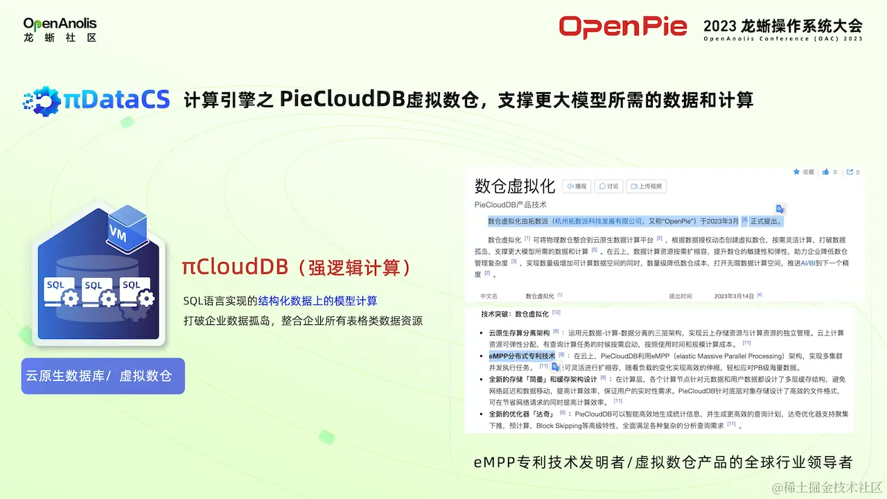 πDataCS 的第三个优势是云原生 eMPP 计算引擎全面颠覆 MPP 技术,打造大模型数据计算新范式。这一优势是通过第一款计算引擎 PieCloudDB Database 来实现的。