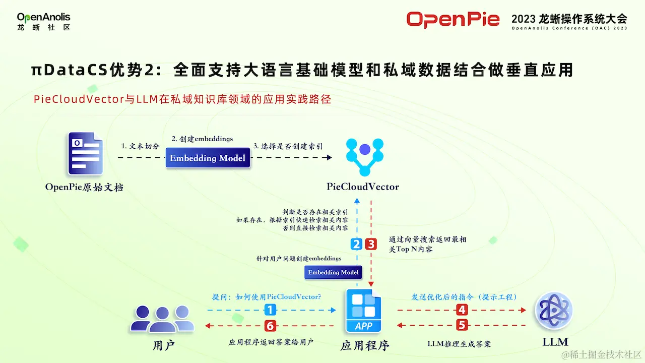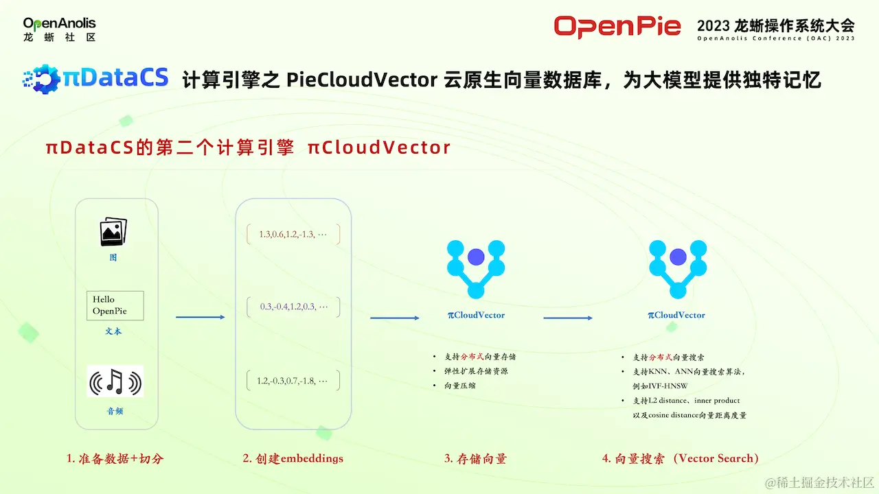 πDataCS 的第二优势是可以全面支持大语言基础模型和私域数据结合做垂直应用。拓数派第二款计算引擎 PieCloudVector,是一款可以用于存储、查询和分析向量数据(比如特征向量)的向量数据库。