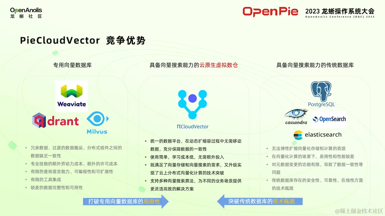 把用户收集的数据或者是公有的数据,通过特征提取,创建一系列 embeddings,存储到向量数组中,再通过其他一些开源框架和大模型进行一个交互。相当于 PieCloudVector 为客户自己构建自有大模型提供存储底座。相对于其他的向量数据库,包括一些专用的数据库,还有传统的关键数据库有这些向量的插件。