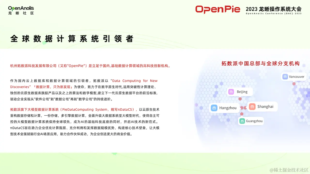杭州拓数派科技发展有限公司(简称“拓数派”,英文名称“OpenPie”)是国内基础数据计算领域的高科技创新企业。作为国内云上数据库和数据计算领域的引领者,以“Data Computing for New Discoveries”「数据计算,只为新发现」为使命,致力于在数字原生时代,运用突破性计算理论、独创的云原生数据库旗舰产品以及之上的算法和数学模型,建立下一代云原生数据平台的前沿标准,驱动企业实现从“软件公司”到“数据公司”再到“数学公司”的持续进阶,加速数字化转型升级。