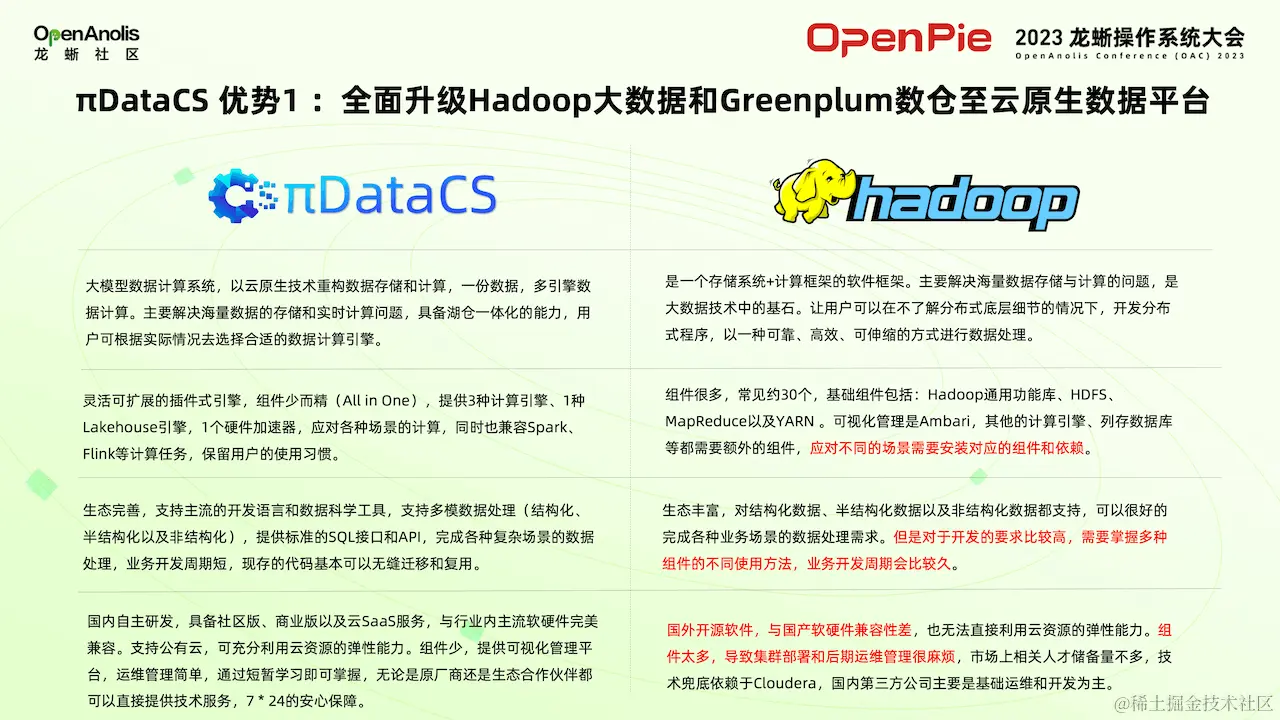 πDataCS 的第一个优势是全面升级 Hadoop 大数据和 Greenplum 数仓至云原生数据平台。打造 πDataCS 是为了全面升级用户的数据平台。曾经谈到大数据时一定会提到 Hadoop,随着时间发展,人们发现 Hadoop 的很多问题,但很多用户的大数据系统还是基于 Hadoop 实现。自从 Hadoop 之后出现很多大数据技术,但只能解决一部分数据问题。例如 MPP 数据库,主要为了处理关系型数据,还有 MySQL 数据库只能处理某一个类型的数据。只有 Hadoop 平台可以使用它的若干个模块来处理所有的数据,包括结构化的、非结构化的、文本、图像等等。同 Hadoop 一样,πDataCS 和也可以通过一个平台多种计算引擎来为客户处理所有数据,包括结构化的、非结构化的、文本、图像等。