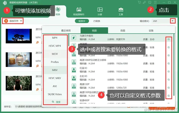 第2步:单击 【添加文件】 按钮,可以继续添加视频文件。单击 【输出格式】 按钮,在 【视频】 窗口选中或者搜索要转换的格式,然后根据自己的需要是否设置 【自定义格式参数】 。