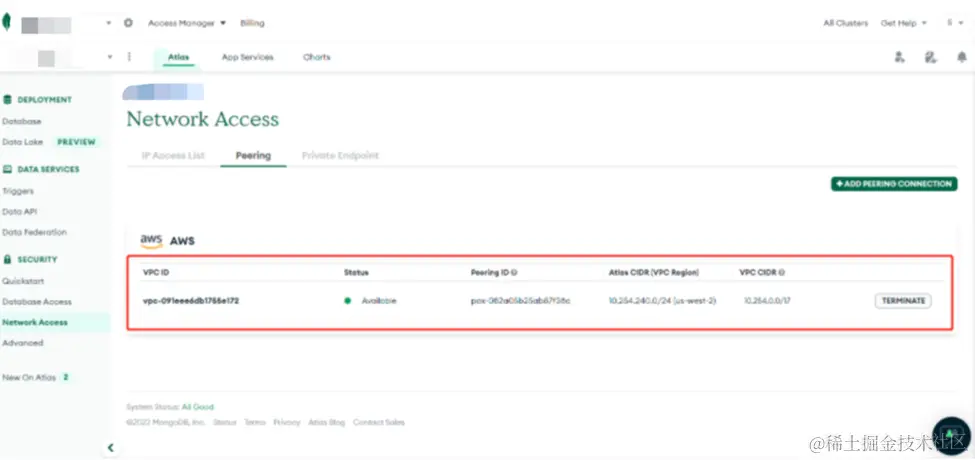 VPC peering connection-网络对等互连在您的 Atlas VPC 和云提供商的 VPC 之间建立私有连接。该连接将流量与公共网络隔离以提高安全性。本篇文章有VPC peering的操作指南以及价格等信息。如还有疑问请联系我们MongoDB的销售,客户成功经理或解决方案架构师。