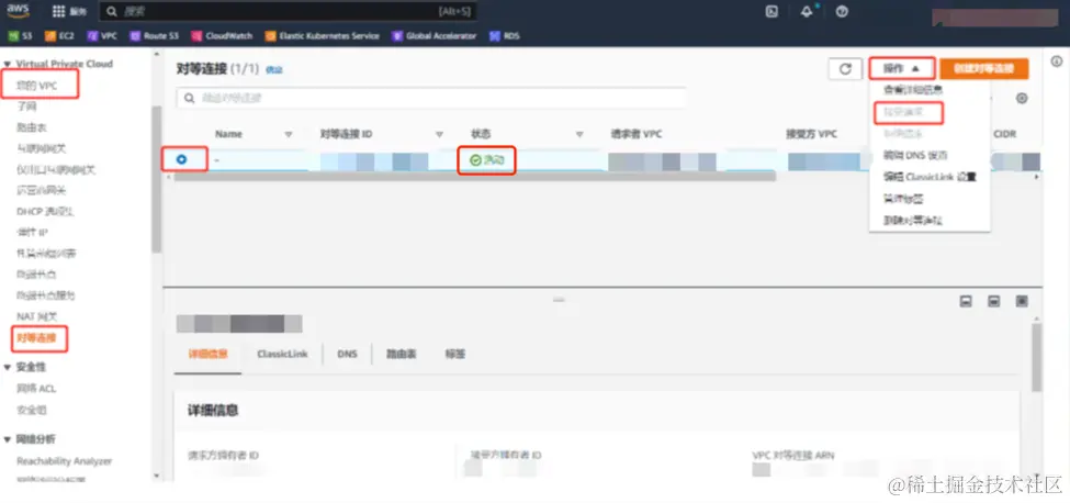 然后在aws vpc对等连接中接受该连接请求。 (请求将在 7 天后过期)