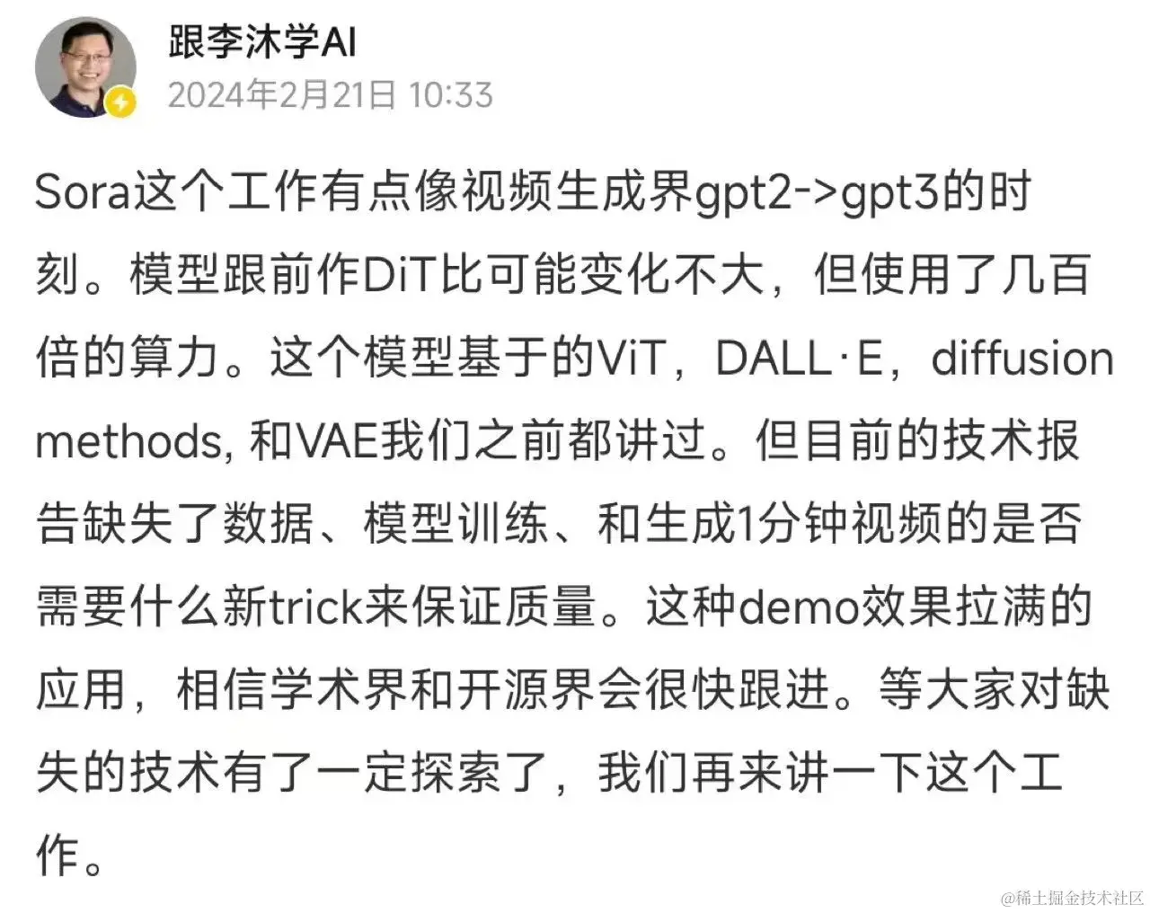 并且前亚马逊首席科学家李沐也表达了自己对Sora模型的观点。