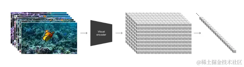 视频信息编码:通过变分自编码器(VAE)将高维的原始视频映射(压缩)到较为低维的隐空间,为了后续transformer计算方便,将这个特征切成不重叠的视频切片,再将这些切片特征拉平成一个token序列,这个token序列其实就是原始视频的表征了,如下图所示: