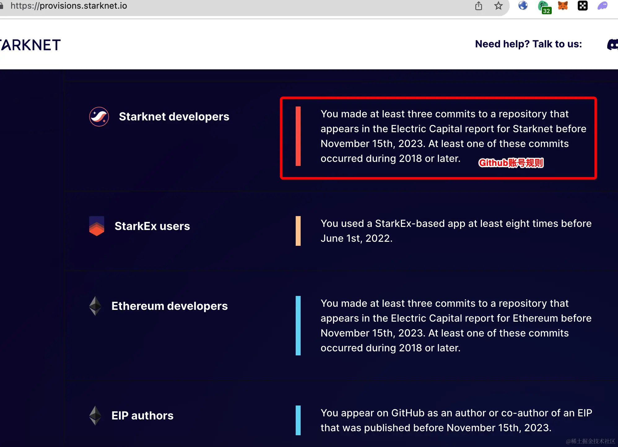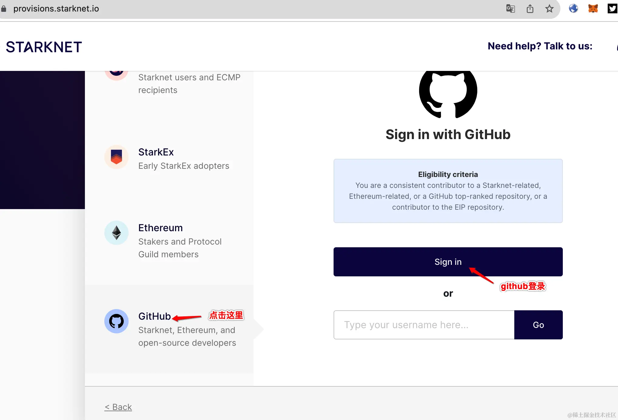 - 打开provisions.starknet.io/ 页面,点击通过 GitHub 登录,查看你的Github账号是否满足空投资格。