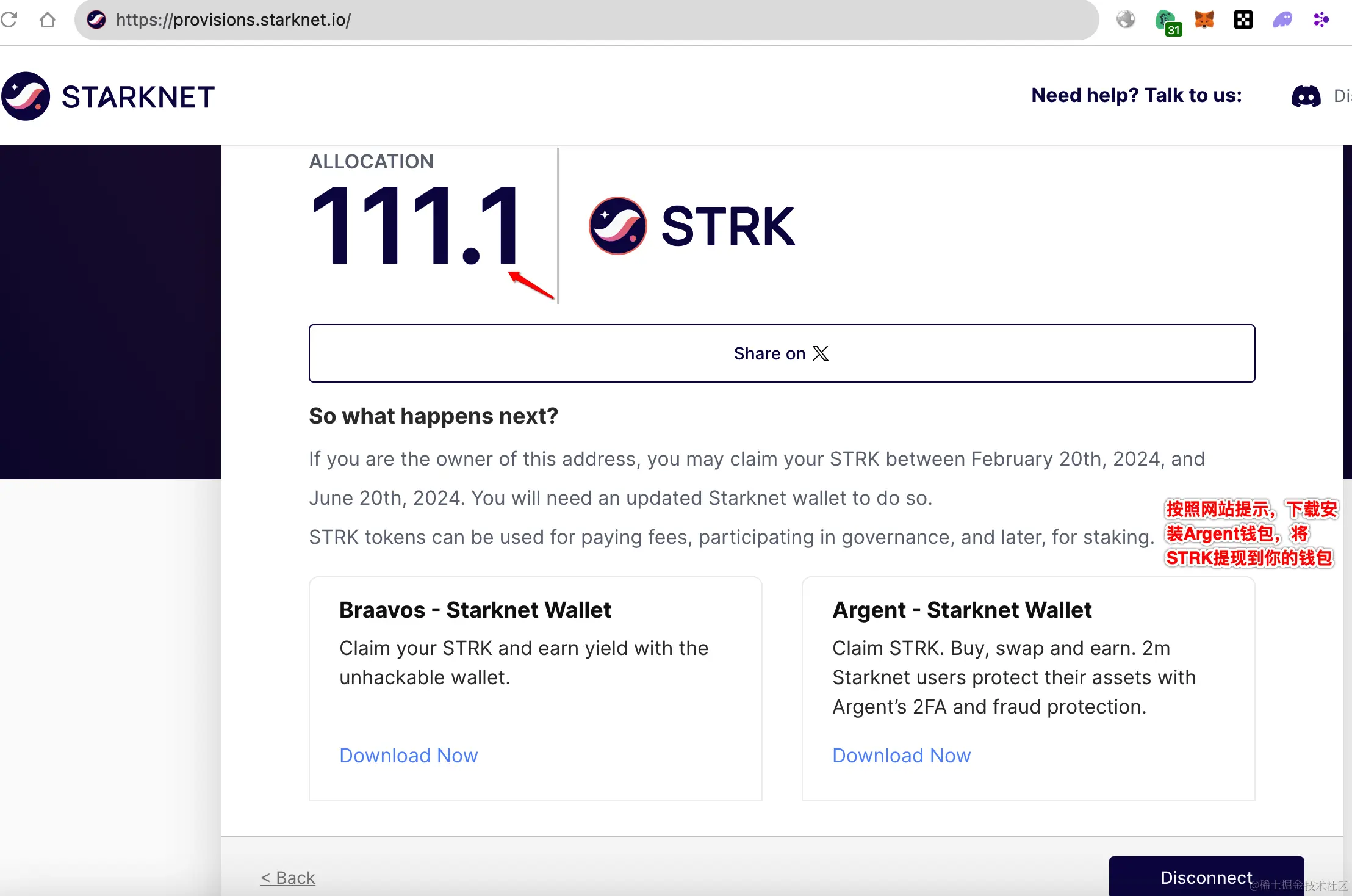 - 按照网站提示,下载安装好Argent Wallet,关联GitHub 账户领取$STRK代币。