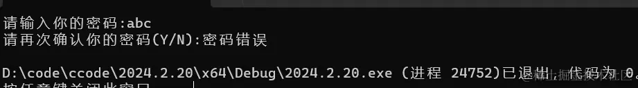 为什么会出现这样的结果呢?这时就要运用缓冲区的知识,在我们输入abc回车(\n)时,缓冲区中的数据为abc\n,而scanf只会读取abc,\n会被一直留在缓冲区。所以在getchar再次读取时会自动读取\n,输出密码错误。