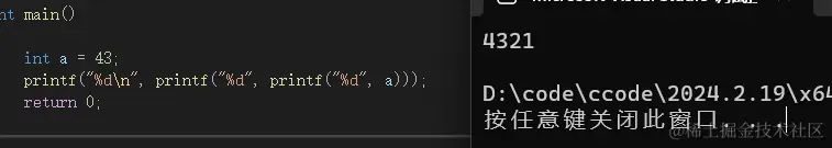 - 然后执行printf("%d", printf("%d", 43)),相当于打印第一步printf的返回值,‘4’,‘3’有两个字符,所以返回值是2。