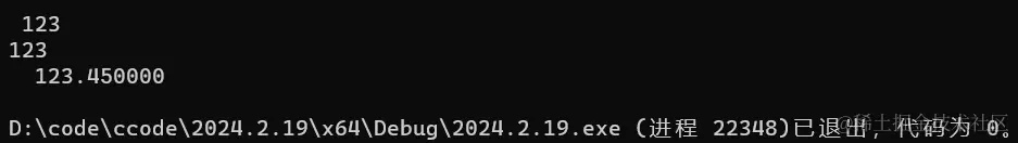 - 对于⼩数,这个限定符会限制所有数字的最⼩显⽰宽度。上⾯⽰例中, %12f 表⽰输出的浮点数最少要占据12位。由于⼩数的默认显⽰精度是⼩数点后6位,所以 123.45 输出结果的头部会添加2个空格。