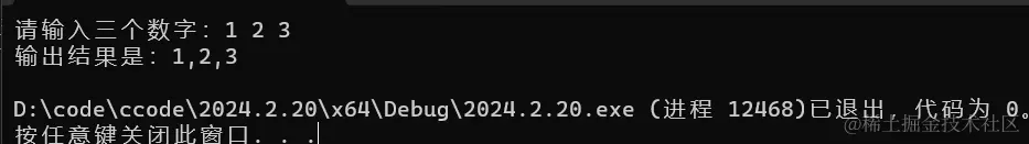printf("输出结果是:%d,%d,%d\n", a, b, c);