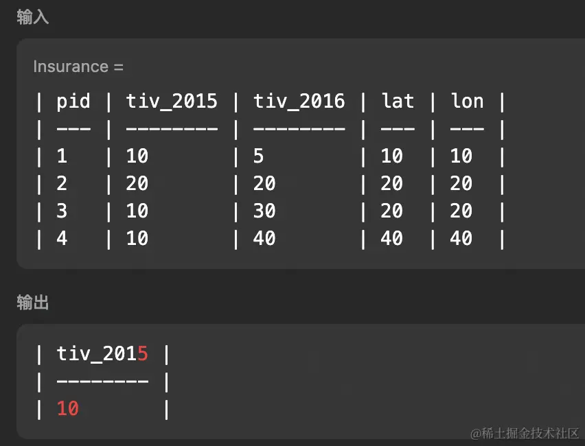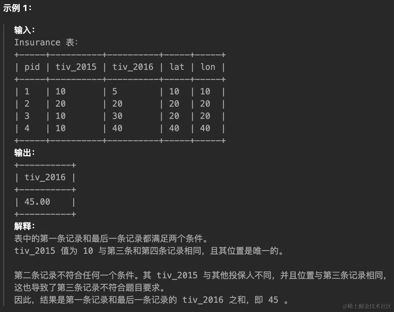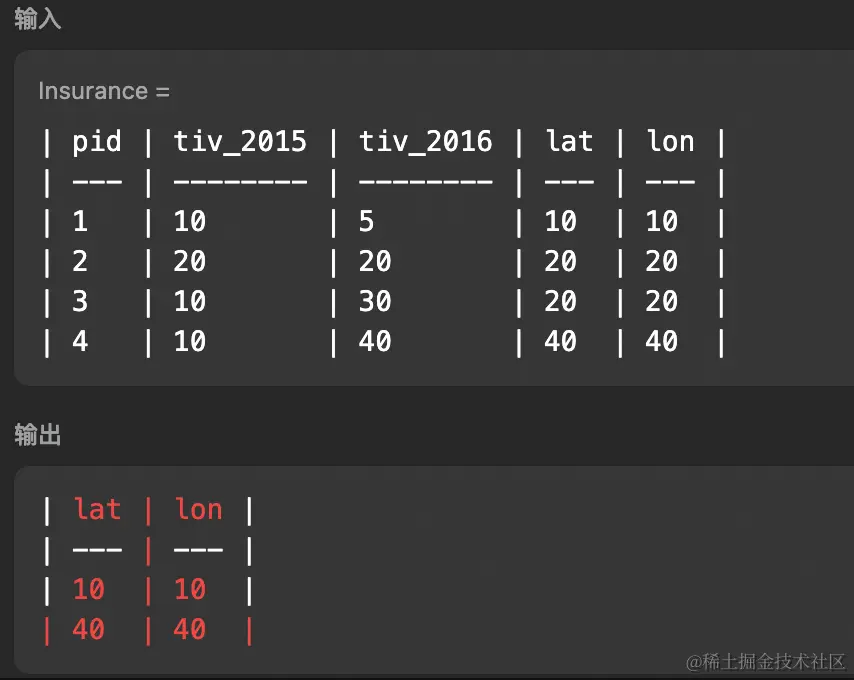 - 再查询出所在的城市必须与其他投保人都不同的情况,也就是 lat 和 lon 分组后,计数只有 1 的查询结果: