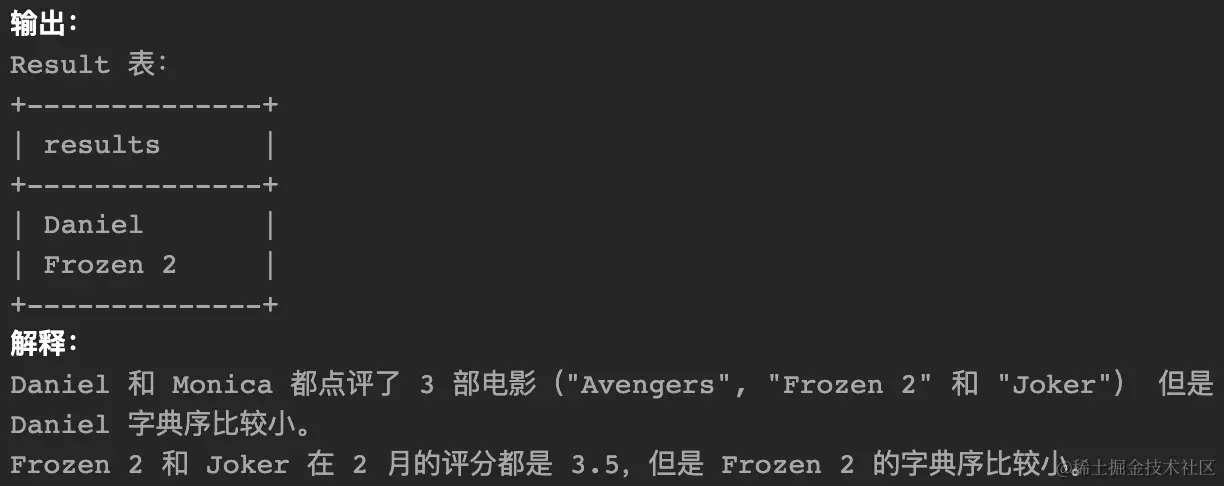 - 查找评论电影数量最多的用户名。如果出现平局,返回字典序较小的用户名。