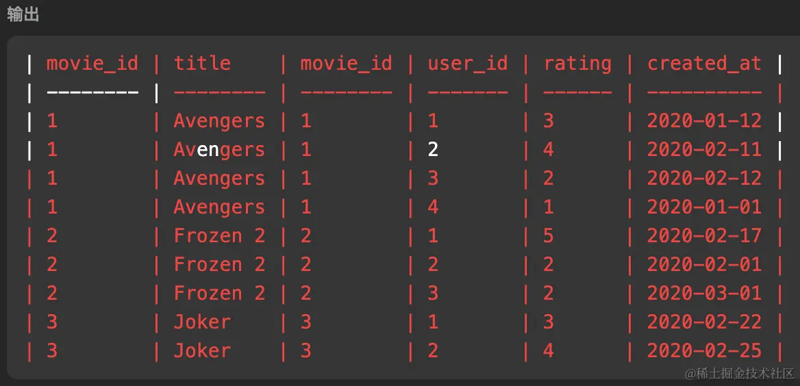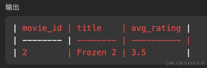 - 同样的,对上面的结果稍作修改,用来查询 2020 年 2 月的电影平均分中+字典序第一位的电影