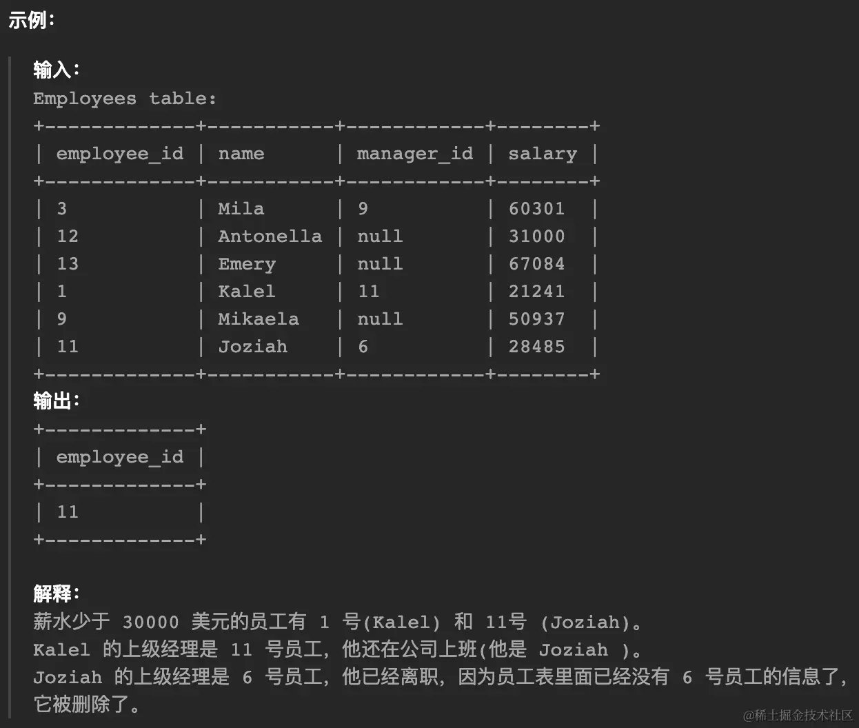 查找这些员工的 id,他们的薪水严格少于 $30000 并且他们的上级经理已离职。当一个经理离开公司时,他们的信息需要从员工表中删除掉,但是表中的员工的 manager_id 这一列还是设置的离职经理的 id 。