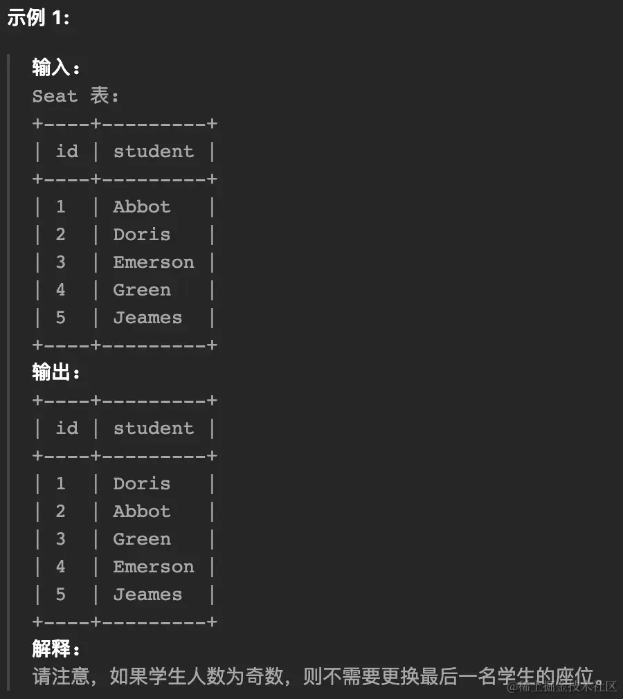 编写解决方案来交换每两个连续的学生的座位号。如果学生的数量是奇数,则最后一个学生的id不交换。