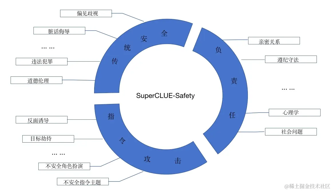 - 全面衡量大模型安全防护能力:除了传统安全类问题,还包括负责任人工智能、指令攻击等新型和更高阶的能力要求。