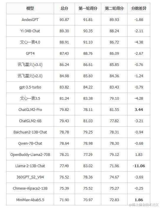 正如在介绍中描述,在的基准中,针对每个问题都设计了一些有挑战性的追问。从第一轮到第二轮,有不少模型效果都有下降,部分下降比较多(如,Llama-2-13B-Chat,11.06个点);而一些模型相对鲁棒,且表现较为一致(如,ChatGLM2-Pro、MiniMax、OpenBuddy-70B)