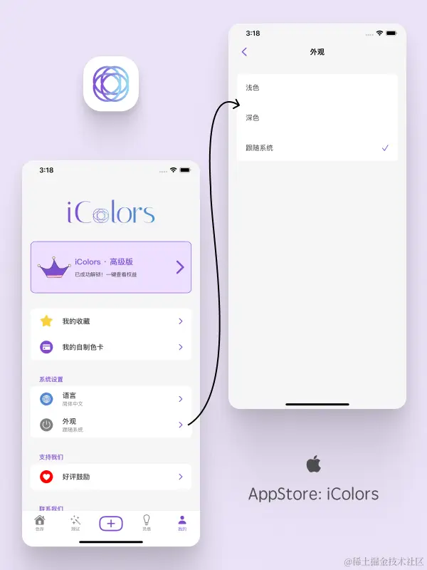 在 iColors 中,我为 App 内部的深浅模式选择设置了一个单独的页面,用户可以手动选择外观是浅色还是深色,亦或是跟随系统。具体的表现如下图所示: