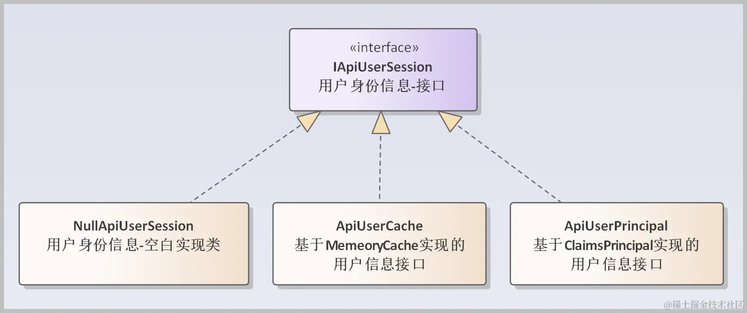 IApiUserSession的一个空白接口定义,它需要依赖于具体的接口实现,我们具体会使用基于Principal或者缓存方式实现记录用户身份的信息实现,如下是它们的类关系。