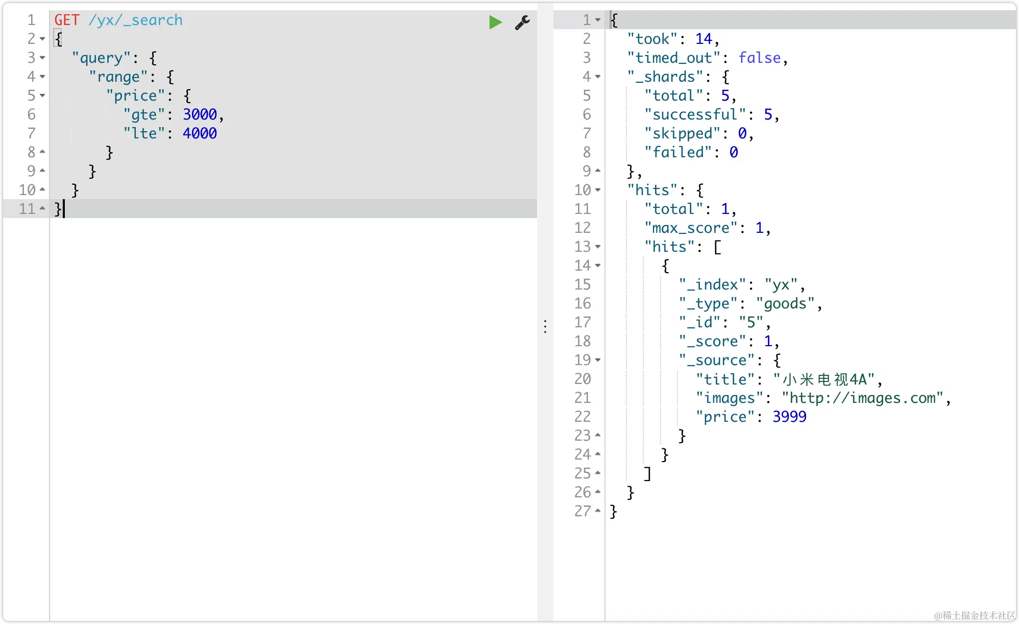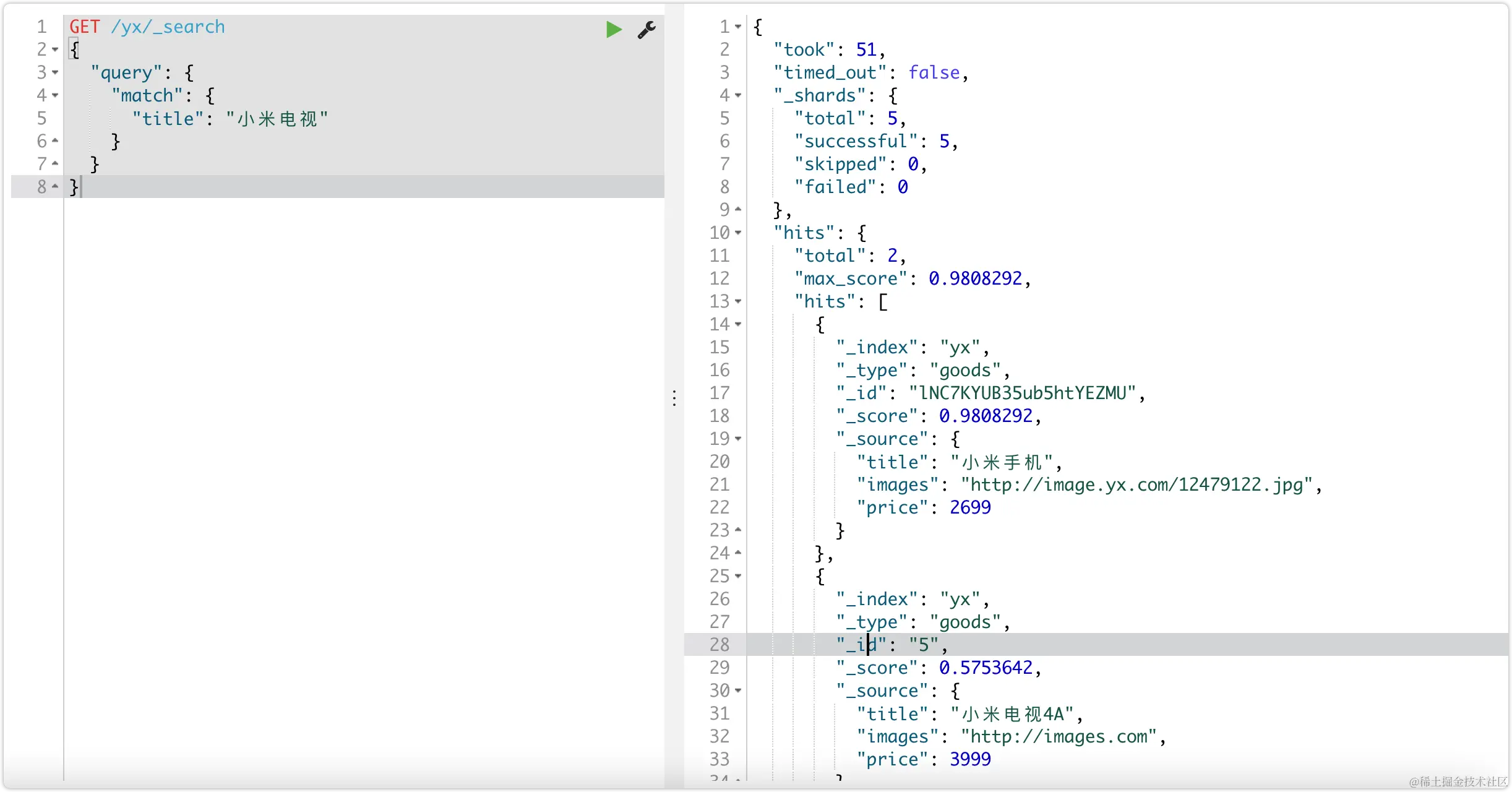 | hits | 搜索结果的文档对象数组,每个元素是一条搜索到的文档信息 |