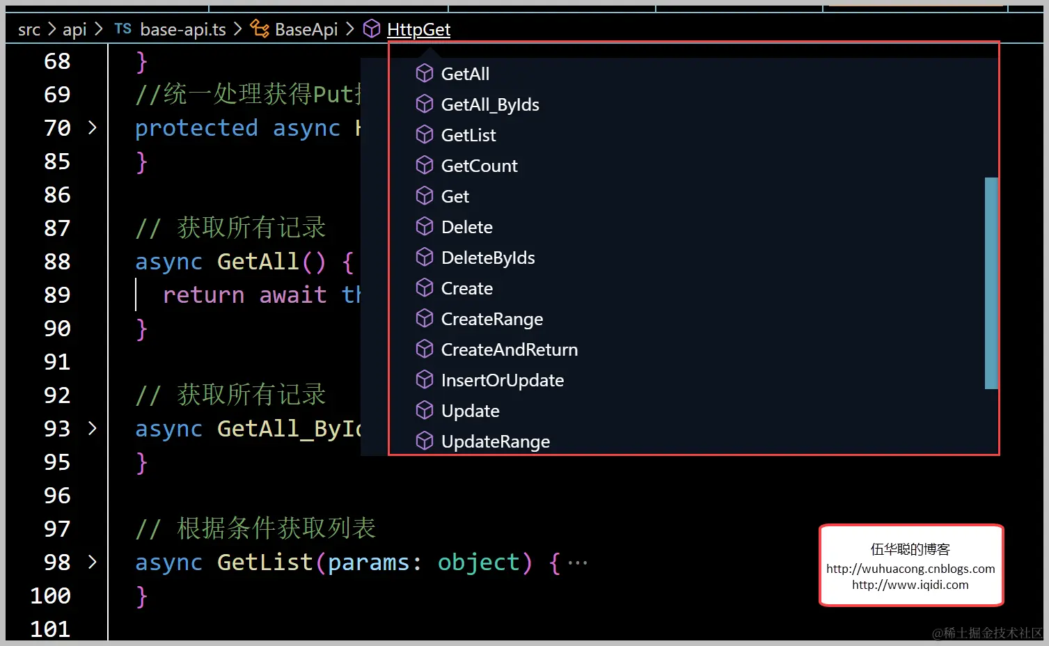 按照这个思路,我们在BaseApi的ES6类里面定义了对应Web API基类里面的操作方法,如下所示。