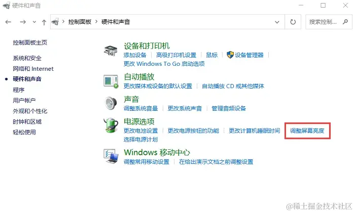在部分电脑中,可以通过显示控制面板调节亮度。电脑亮度怎么调节?通过 【Win+i】 快捷键打开设置面板,然后在搜索框内搜索 【控制面板】 ,点击 【硬件和声音】 进入 【电源选项】 。