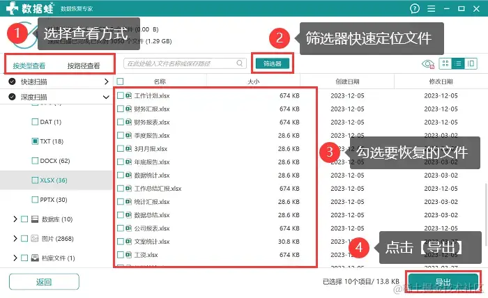步骤3:在深度扫描完成后,会呈现较多的深层数据,用户可以选择合适的查看方式,也可以直接借助【筛选器】对结果进行快速定位,找到需要恢复的文件后,将其勾选上,并点击【导出】 ,选择一个与扫描磁盘不同的磁盘作为保存位置。