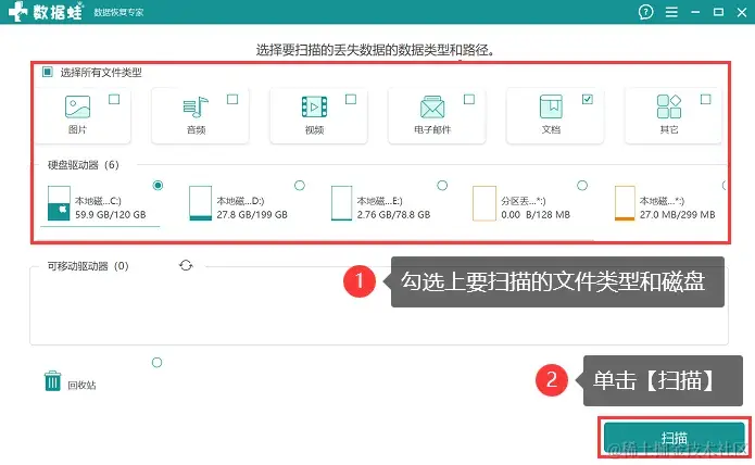 步骤1:运行软件,新用户点击 【免费试用】可直接进入选择界面,用户将需要扫描的文件类型及所需要扫描的磁盘勾选上,点击 【扫描】 ;