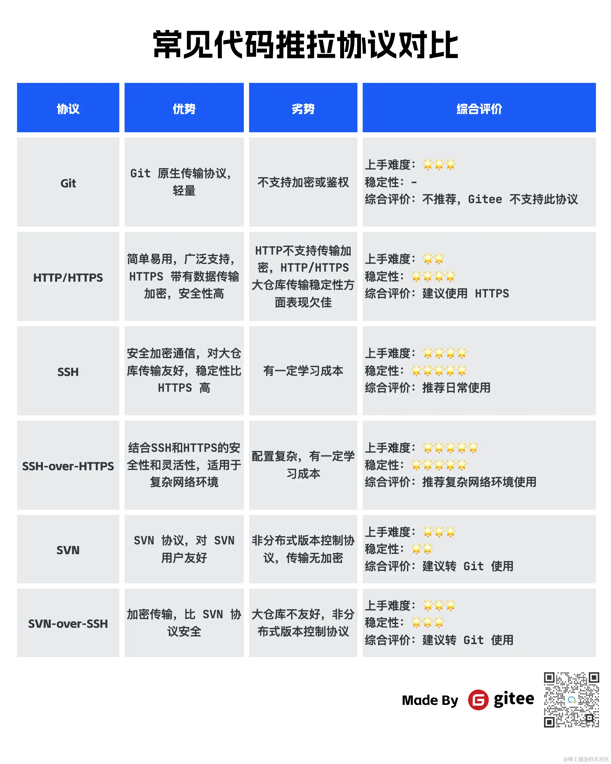 基于上述的内容,笔者总结了常见的代码推拉协议,并对其做了一个简要的评估,供大家参考。