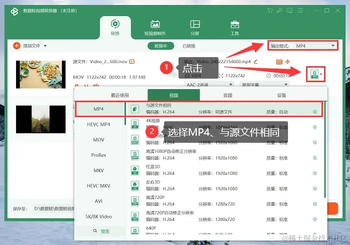 Step 2:如何把视频转换成mp4格式?可以点击视频文件右侧图标,或者通过右上方的 【输出格式】 按钮来选择文件转换格式。在 【视频】 窗口中,选中 【MP4、与源文件相同】 选项。