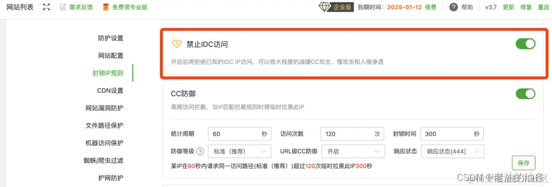 我们只需要在防护网站设置里开启禁止IDC访问即可达成,它还会自动放行真实爬虫以免影响网站收录。