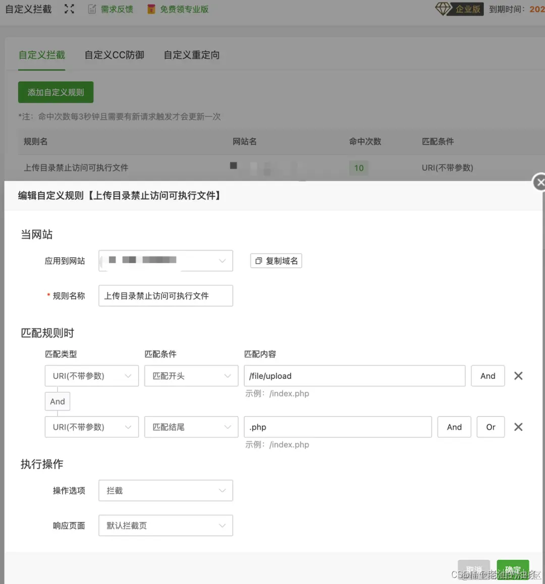 在自定义规则功能里面配置禁止访问/file/upload目录下的所有以.php结尾的文件