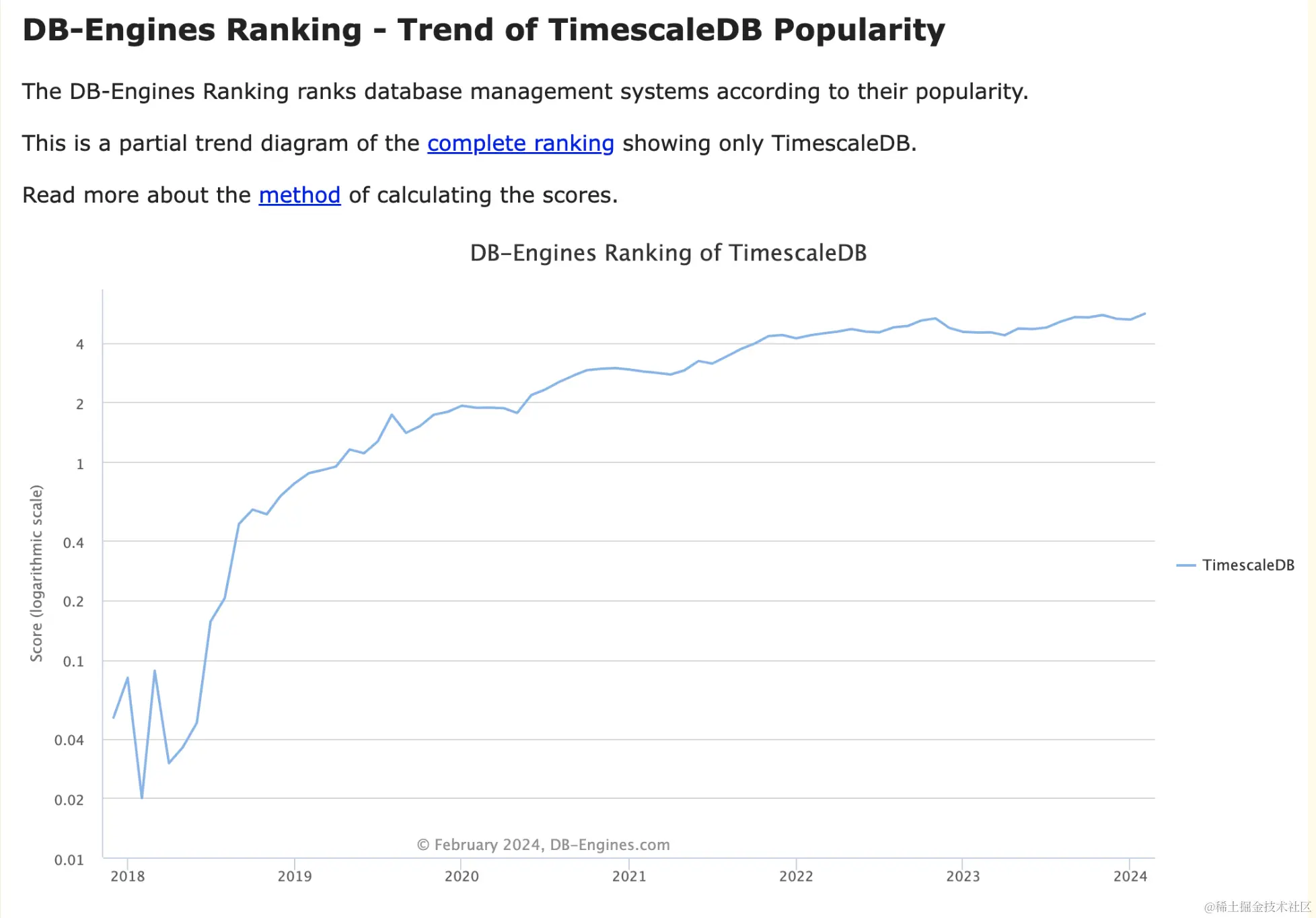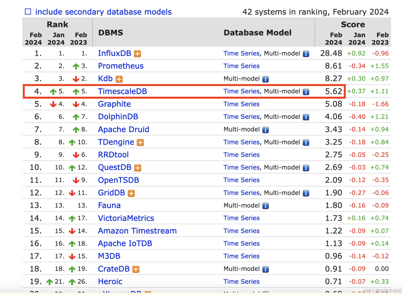 TimescaleDB在DB-Engines中排名的处于第4位,