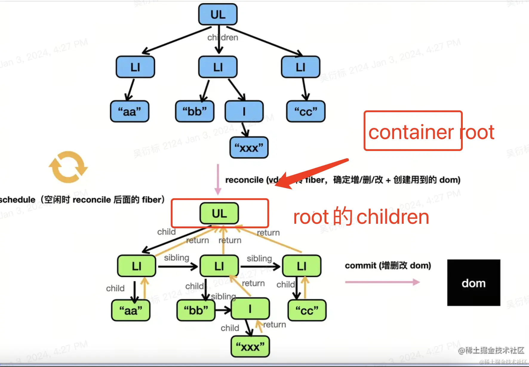 然后它做的事情就是 vdom 转 fiber,也就是 reconcile。