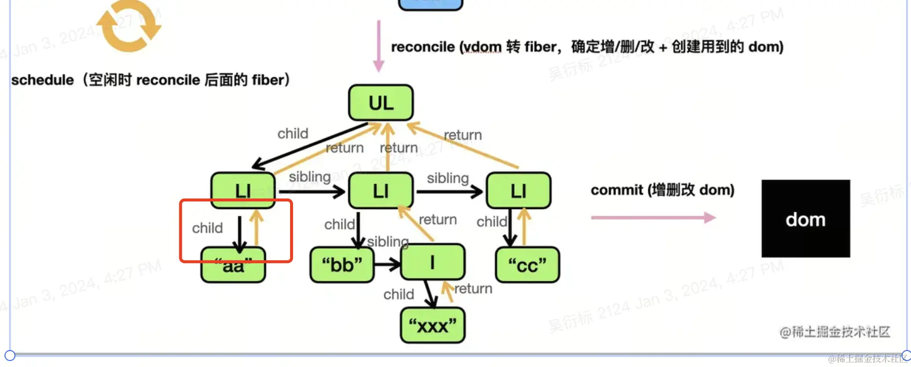 第五次,执行reconcile,aa没有child,也没有sibling,则找寻父节点return到第一个li中,横向找到第二个Li,建立child、sibling、return关联关系。