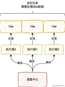 举个例子,比如你现在需要处理30w条数据,有3个执行器,此时使用分片广播,那么此时可将任务分成3分,每份10w条数据,执行器根据自己的编号选择对应的那份10w数据处理