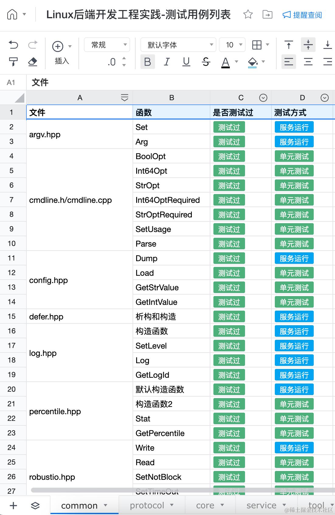 在MyRPC框架设计与实现那章中,为了实现一个高性能、易读、结构清晰且代码量适中的RPC框架,我反复实现了四个版本的RPC框架。为了确保RPC框架代码的正确性,我编写了102个单元测试用例,并对RPC框架所有的代码进行了充分的测试,最后对RPC框架还进行了完备的性能压测和内存泄漏的检测。为了更好的管理测试用例,我专门创建了一个excel文档对测试用例进行管理,这个excel文档部分内容如图2-1所示。