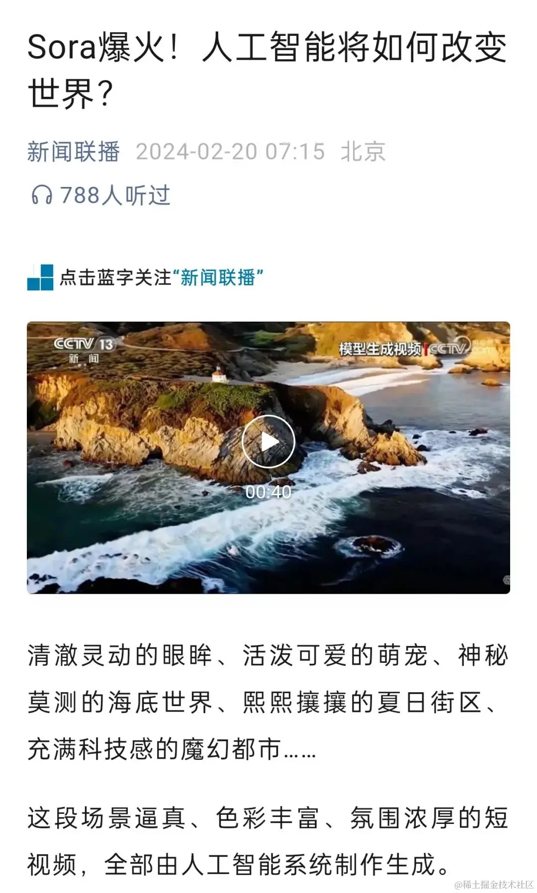 这几天最火的莫过于Sora**,这个由OpenAI研发的文生视频功能,一经发布就震惊全网。连新闻联播也开始发文了。