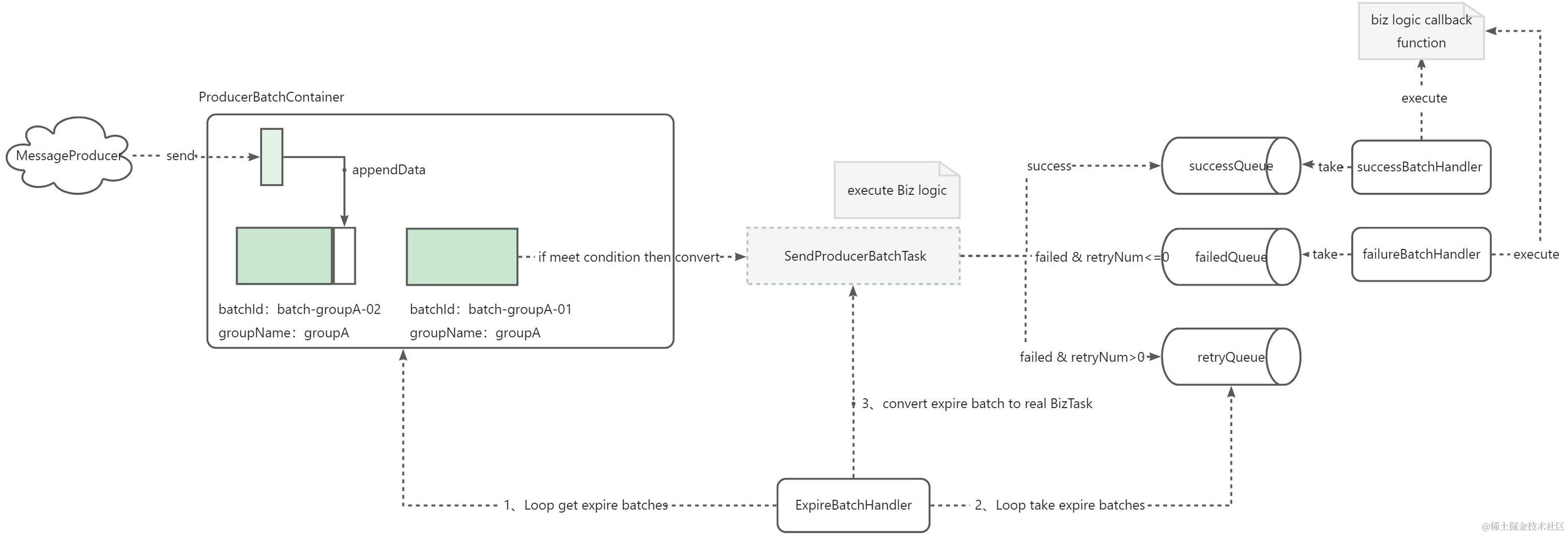 ExpireBatchHandler本质是一个线程对象,这个线程在启动之后会不断检测 攒批容器和重试队列是否存在过期的攒批任务,如果存在就会将这些到达存活时间的攒批队列转为“攒批消费任务”并执行指定的业务逻辑。