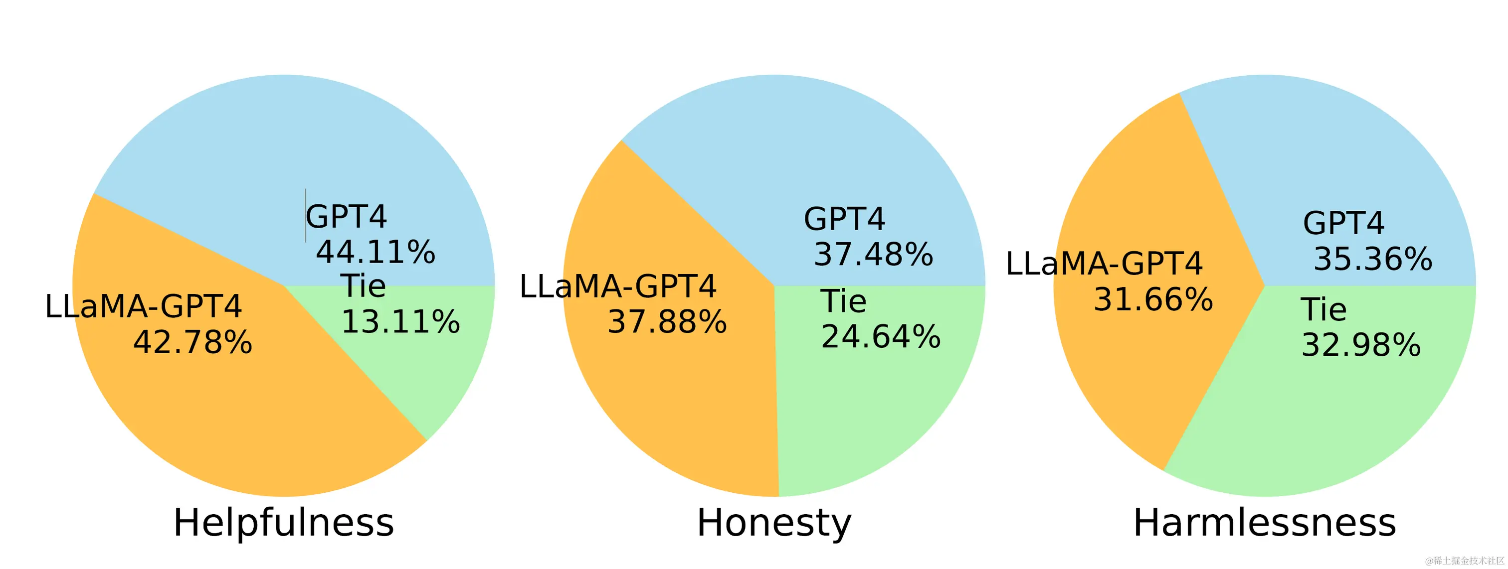 - LLaMA-GPT-4 在所有三个标准中的表现与原始 GPT-4 相似,这为开发最先进的遵循指令的 LLM 提供了一个有希望的方向。