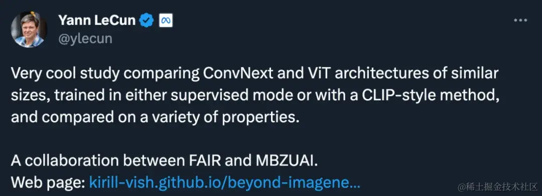 在分析中,研究者发现不同架构和训练范式的模型行为存在很大差异。例如,模型在 CLIP 范式下训练的分类错误少于在 ImageNet 上训练。不过,监督模型的校准效果更好,在 ImageNet 稳健性基准测试中普遍更胜一筹。ConvNeXt 在合成数据上有优势,但比 ViT 更偏重纹理。同时,有监督的 ConvNeXt 在许多基准测试中表现出色,其可迁移性表现与 CLIP 模型相当。可以看出,各种模型以独特的方式展现了自己的优势,而这些优势是单一指标无法捕捉到的。研究者强调,需要更详细的评估指标来准确选择特定情境下的模型,并创建与 ImageNet 无关的新基准。基于这些观察,Meta AI 首席科学家 Yann LeCun 转发了这项研究并点赞: