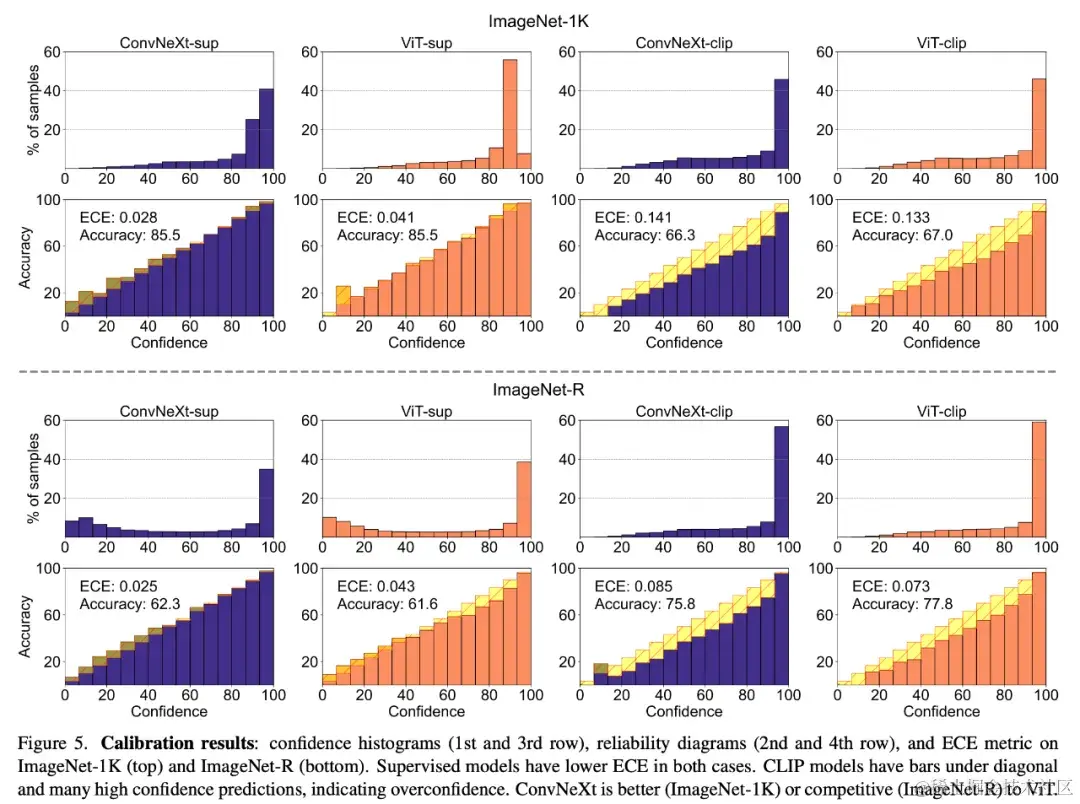 1. CLIP 模型过于自信,而监督模型则略显不足。