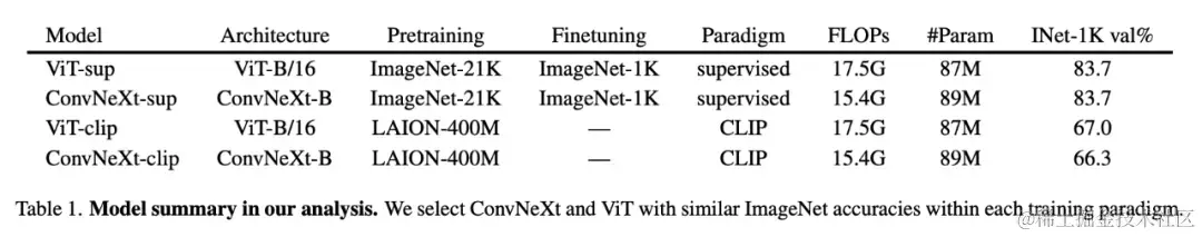 模型选择对于监督模型,研究者使用了 ViT 的预训练 DeiT3- Base/16,它与 ViT-Base/16 架构相同,但训练方法有所改进;此外还使用了 ConvNeXt-Base。对于 CLIP 模型,研究者使用了OpenCLIP中 ViT-Base/16 和 ConvNeXt-Base 的视觉编码器。请注意,这些模型的性能与最初的OpenAI模型略有不同。所有模型检查点都可以在 GitHub 项目主页中找到。详细的模型比较见表 1: