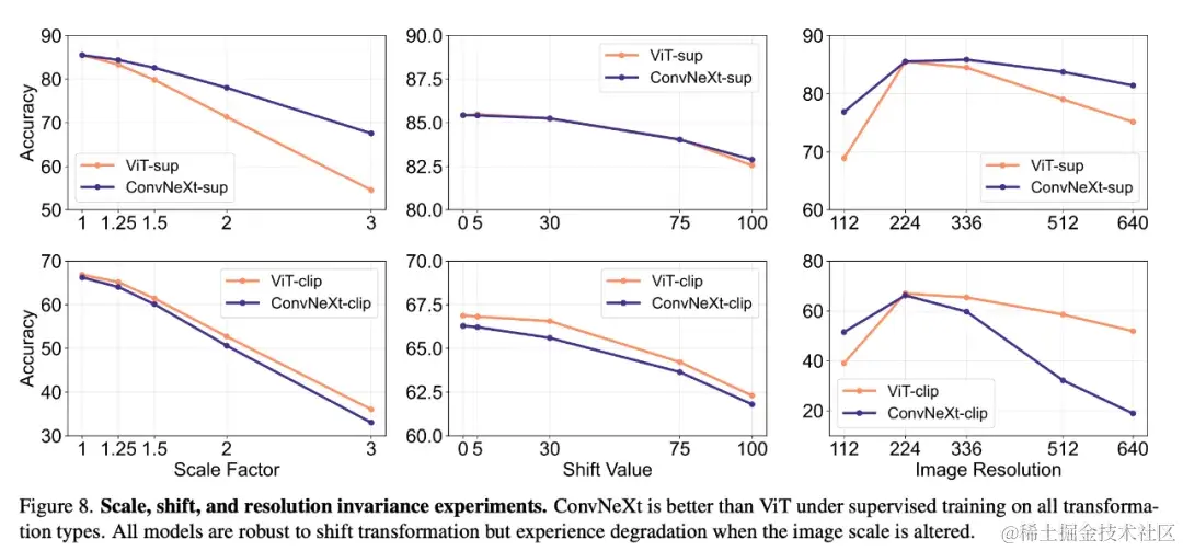 1. 在许多基准上,有监督 ConvNeXt 的性能都优于有监督 ViT:它的校准效果更好,对数据转换的不变性更高,并表现出更好的可迁移性和稳健性。