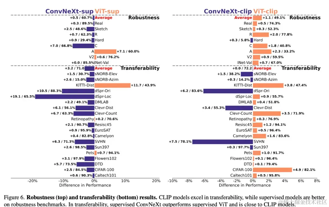 稳健性和可迁移性模型的稳健性和可迁移性对于适应数据分布变化和新任务至关重要。研究者使用各种 ImageNet 变体对稳健性进行了评估,结果发现,虽然 ViT 和 ConvNeXt 模型的平均性能相当,但除 ImageNet-R 和 ImageNet-Sketch 外,有监督模型在稳健性方面普遍优于 CLIP。在可迁移性方面,通过使用 19 个数据集的 VTAB 基准进行评估,有监督的 ConvNeXt 优于 ViT,几乎与 CLIP 模型的性能相当。